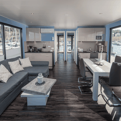 Beide Hausboote bieten Ihnen luxuriösen Komfort: voll ausgestattete Küchen, moderne Bäder, zwei separate Schlafkajüten für je zwei Personen, eine ausziehbare Couch im Wohnbereich und natürlich die großzügigen Außenterrassen. Bis zu vier Personen finden hier Platz für gemeinsame Erinnerungen.